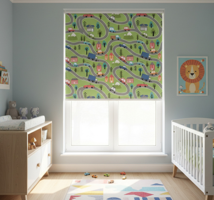 Reference: E6901Introducing our stunning Blind children colorful street with racing cars roller blind, designed to ignite the imagination of young ones! This vibrant roller blind features a playful street scene filled with colorful racing cars, ideal for any child's room. The design captivates with its lively colors and dynamic imagery, making it a delightful addition to your space. Not only does it enhance the overall decor, but it also serves practical purposes such as protecting the room from direct sunlight and providing privacy when lowered!
