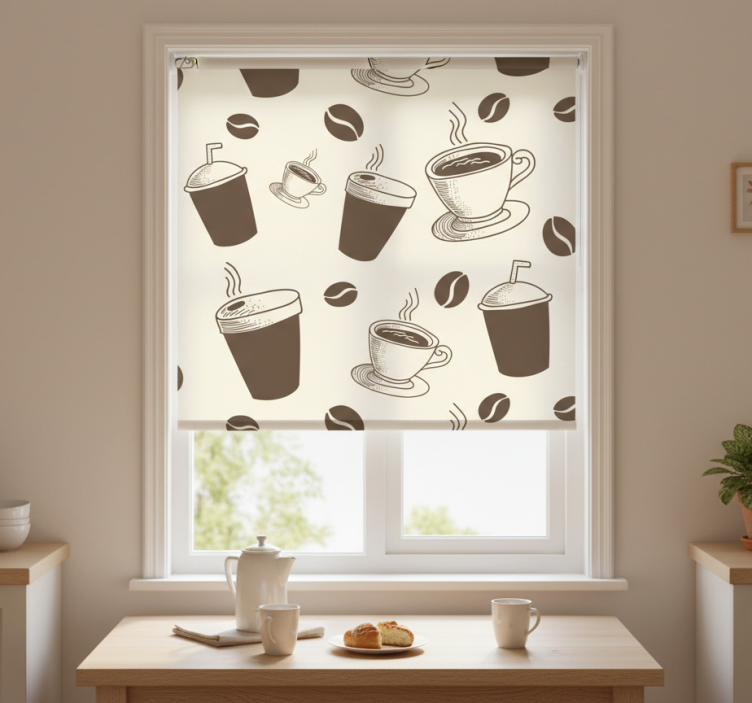 Reference: E6285Introducing our stunning Blind kitchen coffee cup designs, a perfect fusion of creativity and functionality! This unique design showcases a playful blend of coffee-themed graphics that will surely bring joy to your kitchen. With its vibrant colors and charming motifs, this design enhances your kitchen's ambiance, making it a delightful space for coffee lovers. The roller blind not only serves as a beautiful decorative element but also offers practical features such as easy assembly in just two clicks, a quick cleaning process, and the ability to customize measurements.