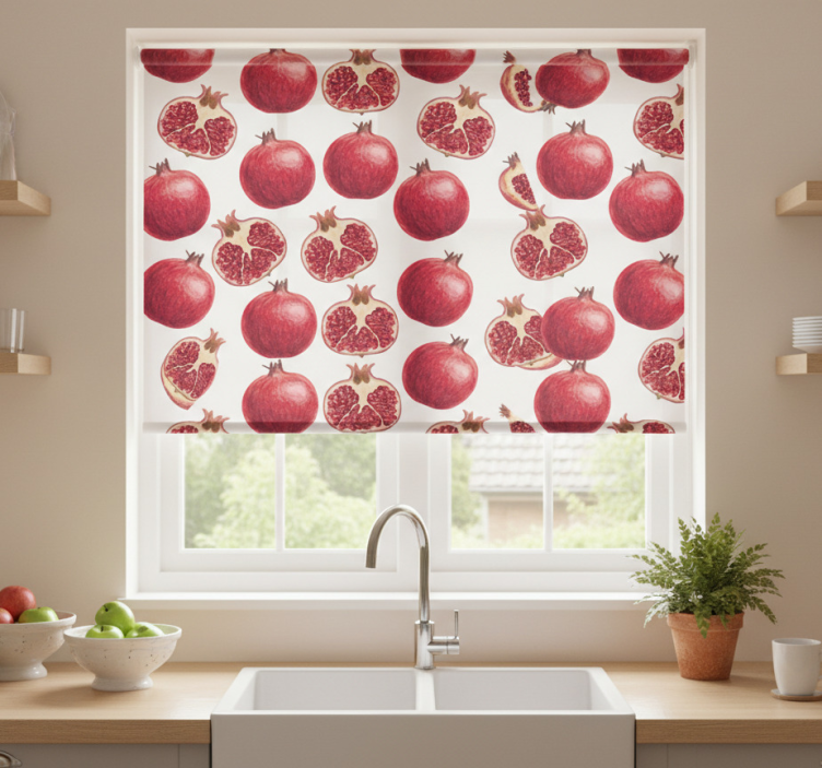 Reference: E6280Introducing our stunning Blind kitchen pomegranate harvest, a beautifully designed roller blind that effortlessly enhances your kitchen decor. Featuring an elegant pomegranate pattern, this roller blind not only adds a touch of sophistication but also offers functionality with easy assembly in two clicks, easy cleaning, and disassembly that allows for quick window maintenance. Enjoy the perfect blend of style and practicality!