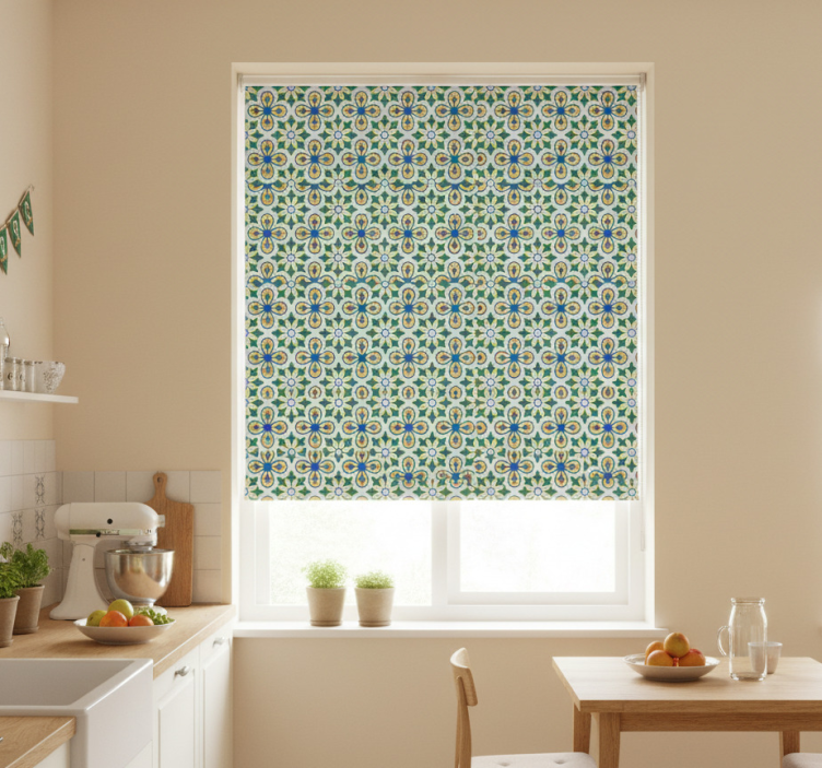 Reference: E6406Introducing our stunning Blind kitchen with yellow and blue portuguese tile, a perfect blend of style and functionality! This roller blind features vibrant yellow and blue patterns inspired by traditional Portuguese tiles, creating a lively atmosphere in your kitchen. With easy assembly in just two clicks, effortless cleaning options, and the ability to regulate room temperature while maintaining privacy, this roller blind is the ultimate choice for modern living!