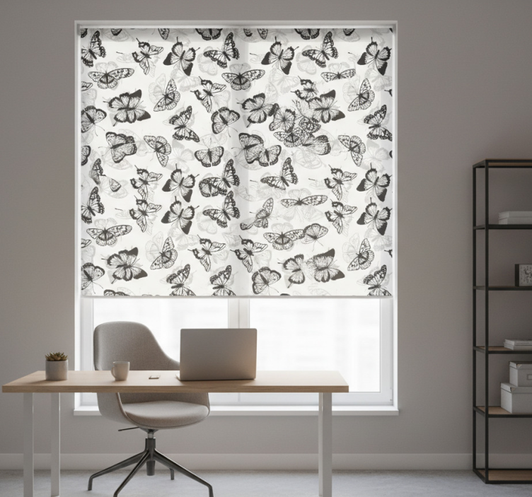 The Blind office black delicate butterfly design blind office is more than just a window covering; it's an inspirational piece that transforms your workspace into a haven of creativity. With its enchanting butterfly design, this blind adds a touch of sophistication while providing privacy and protection from direct sunlight. Elevate your office decor with this beautiful roller blind that not only beautifies your space but also creates a serene environment conducive to productivity!