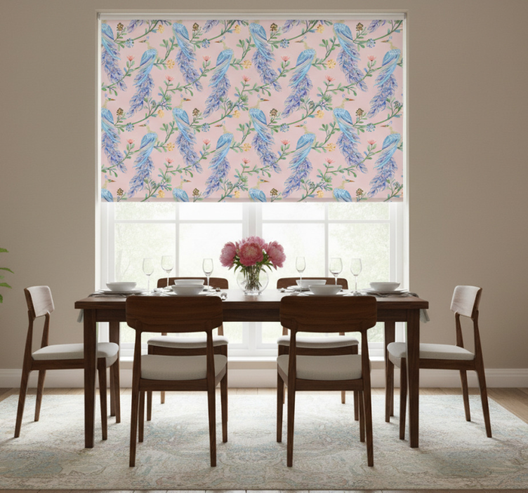 The Dining room blind birds in pink paradise dining room blind is not just a window covering; it is an artistic statement that enhances the overall aesthetic of your dining area. Its enchanting design breathes life into any room, making it an ideal choice for those looking to elevate their home decor. Whether you're hosting a dinner party or enjoying a cozy meal with family, this roller blind creates a welcoming atmosphere that inspires warmth and conversation.