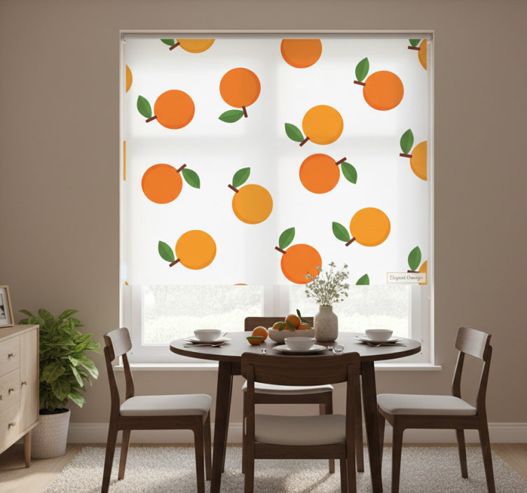 Elevate your interior with the Dining room blind in elegant oranges design dining room blind, a statement piece that effortlessly complements various decor styles. This roller blind adds a splash of color and sophistication to your dining space, making it an inspiring backdrop for family gatherings and entertaining guests. Its vibrant design creates a warm atmosphere, encouraging a sense of comfort and joy in your home.