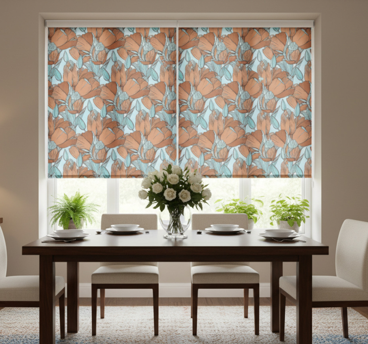 The Dining room blind with brown tulips artistic blue design dining room blind is more than just a window covering; it’s a statement piece that enhances the aesthetic of your dining area. Its artistic design brings warmth and character to your space, inspiring delightful conversations and memorable meals. Perfect for those who appreciate beauty and functionality, this blind allows you to create a stunning ambiance that captivates every guest!
