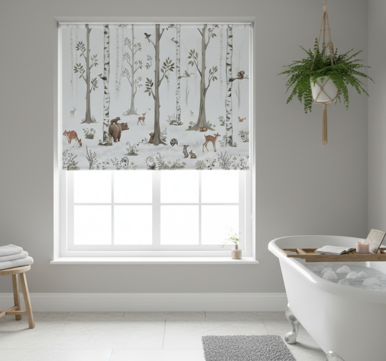 Reference: E6159Introducing our Tree blind playful woodland design, a delightful addition to your home decor! This unique roller blind features a whimsical woodland scene, bringing the beauty of nature indoors with its intricate patterns of trees, playful animals, and vibrant colors. The design is perfect for creating a cheerful atmosphere, while still offering the practicality you need. With easy assembly in just two clicks, easy cleaning, and customizable measurements, this roller blind enhances both style and functionality.