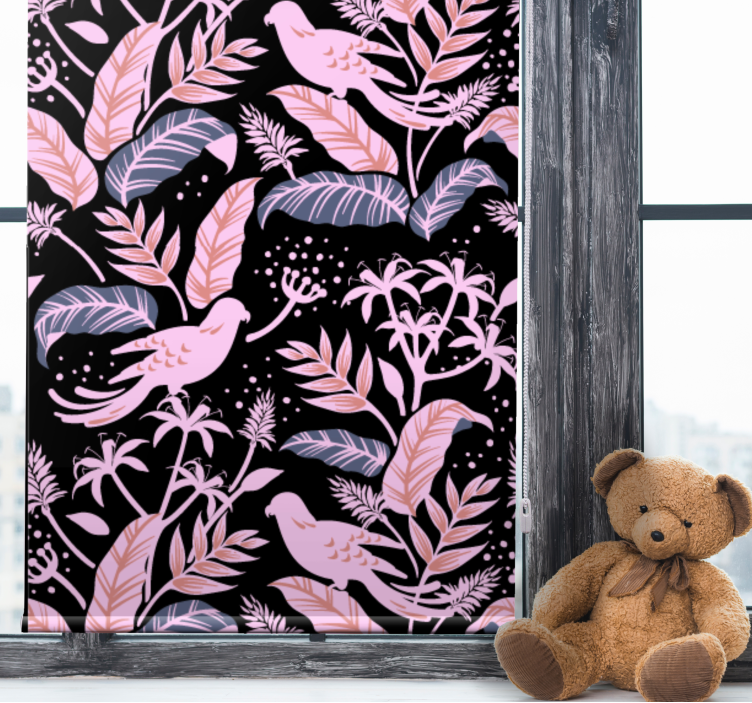 Transform your space with our stunning Tropical bird motifs animals blind, featuring vibrant birds and lush flora in a delightful pattern of pink leaves. This exquisite design brings a touch of nature indoors, creating a lively atmosphere that is sure to captivate all who enter your home!