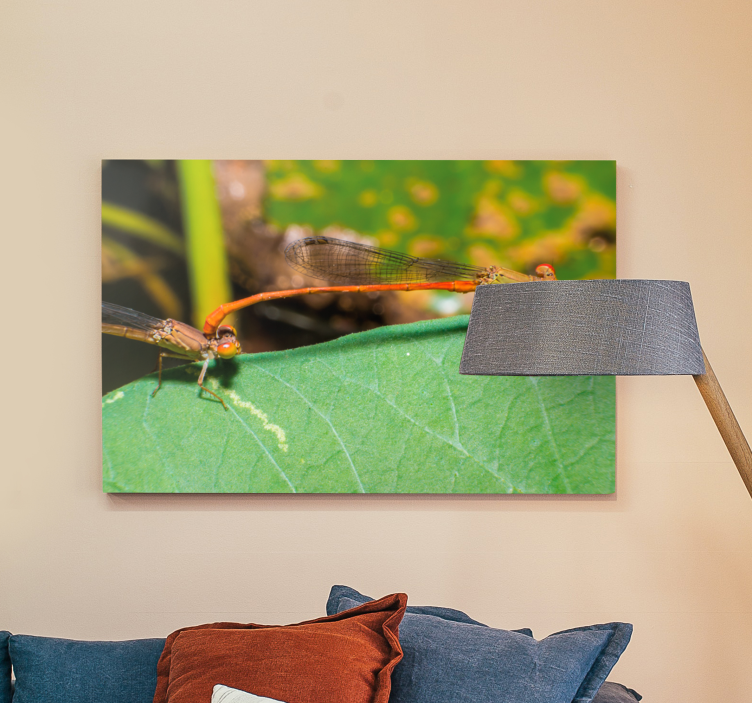 Immerse yourself in the beauty of nature with our Dragonfly canvas pair of dragonflies. This stunning design captures the intricate details of dragonflies perched delicately on vibrant green leaves, creating a breathtaking close-up photography piece that brings the outdoors inside. The artistic representation of these insects in their natural habitat makes it a perfect addition for any nature lover!
