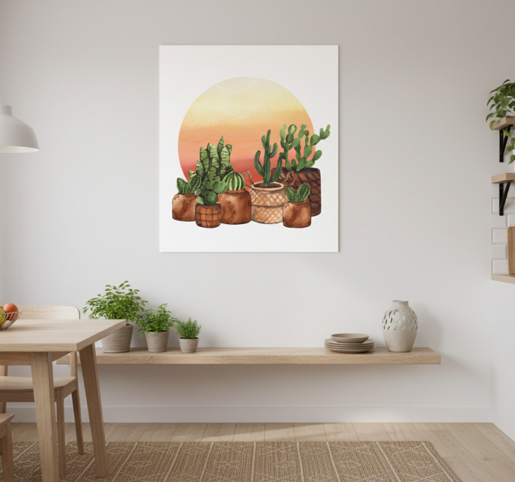 Reference: G657Introducing our stunning Kitchen poster cactus sunset in circle, a delightful piece of art that beautifully captures the essence of a serene sunset framed by vibrant cacti. The design features a breathtaking sunset palette with high colour intensity that brings warmth and energy to your space. Printed on premium 180g/m2 paper, this poster boasts a semi-matt finish, ensuring a reflection-free view that enhances its captivating imagery.