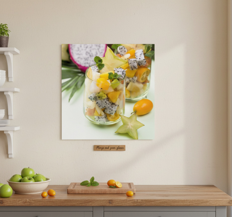 Reference: G598Introducing our stunning Kitchen poster mango and green glasses, a vibrant and artistic addition to your culinary space! This beautifully designed poster features a delightful fusion of fresh mangoes and refreshing green glasses, showcasing high colour intensity that brings warmth and joy to any kitchen. With its 180g/m2 grammage and semi-matt finish without reflections, it perfectly captures the essence of tropical bliss, making it a must-have for those who appreciate art and style!