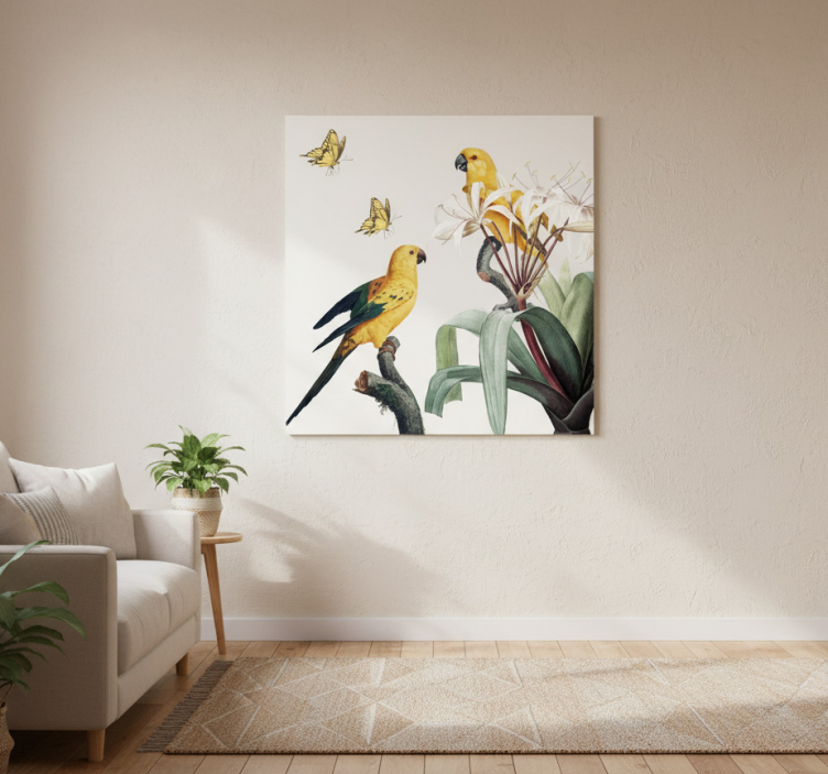 The Living room poster of parrots with yellow flowers living room poster is not just a piece of art; it's an invitation to experience the beauty of the jungle right in your home. Imagine your guests marveling at the vivid colors and intricate details, sparking conversations and lifting spirits. This poster can transform a dull wall into a focal point of joy and creativity, making every gathering feel more vibrant and alive!