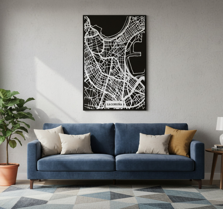 Enhance your decor effortlessly by using the Living room poster topographic map of Coruña wall posters for living room. The best option is to use double-sided adhesive tape on the back of the poster for a clean look. Alternatively, frame it for a more polished appearance. For a quick and easy option, thumbtacks or reusable blu-tack can also be used to display this beautiful piece.