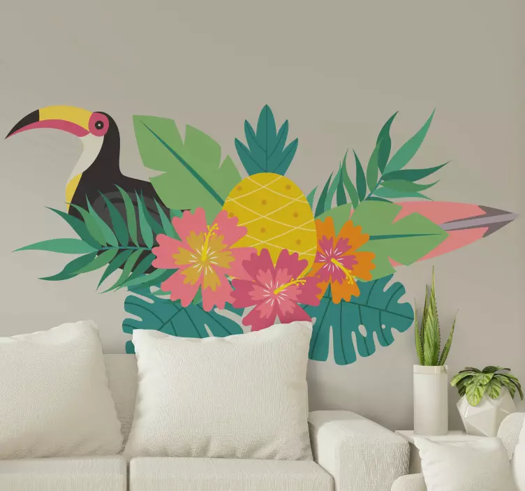 Transform your living space with our Animal wall sticker tropical bird design, featuring a stunning array of vibrant colors that bring the beauty of nature indoors. This delightful design showcases a tropical toucan surrounded by lush greenery, colorful flowers, and refreshing pineapple motifs. Each element harmonizes to create a lively atmosphere that brightens any room!