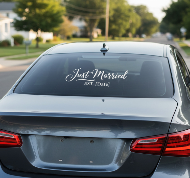 Reference: A54572Celebrate your love with our Car sticker just married decal! This delightful design features elegant script intertwined with charming decorative elements, making it the perfect accessory for your getaway vehicle. With its eye-catching colors and smooth satin finish, this decal will radiate joy and festivity as you embark on your new journey together!