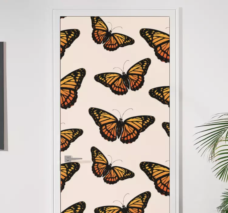 Transform your space with our Door sticker colorful butterfly illustration, featuring a stunning design of vibrant monarch butterflies gracefully fluttering across a beautiful pattern. This decorative piece captures the essence of nature with its vivid orange hues, making it the perfect addition to any door. Let the beauty of these butterflies bring life and joy into your surroundings!