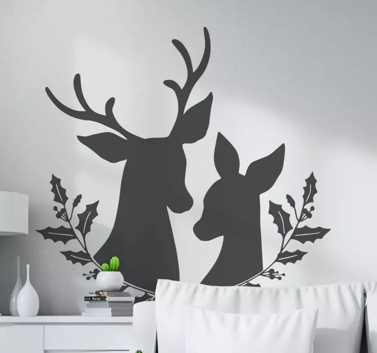 Transform your living space with our Farm animal sticker stylized deer shapes farm animal sticker that brings a touch of nature indoors! Imagine the serene atmosphere created by these graceful deer silhouettes, surrounded by lush leaves and a delightful laurel wreath. This decorative piece serves as an inspiration to reconnect with the beauty of wildlife, making your home feel warm and inviting. It's not just a sticker; it's a statement of your love for nature!