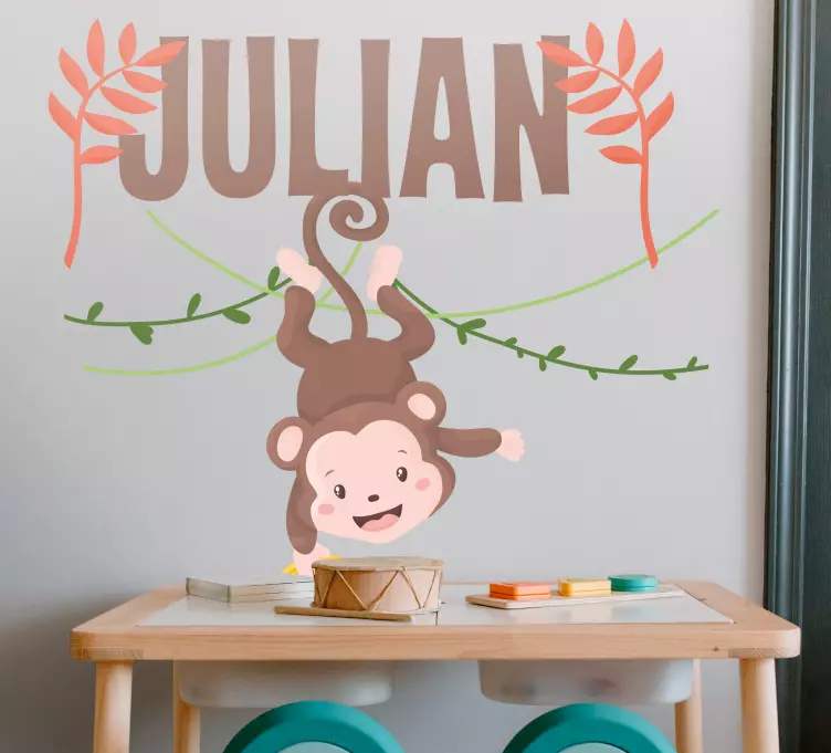 Reference: A49357A charming design featuring a cute monkey hanging upside down from a vine. The design includes vibrant leaves and an option for personalization, making it perfect for children's spaces. The playful expression of the monkey adds a joyful touch to any setting.