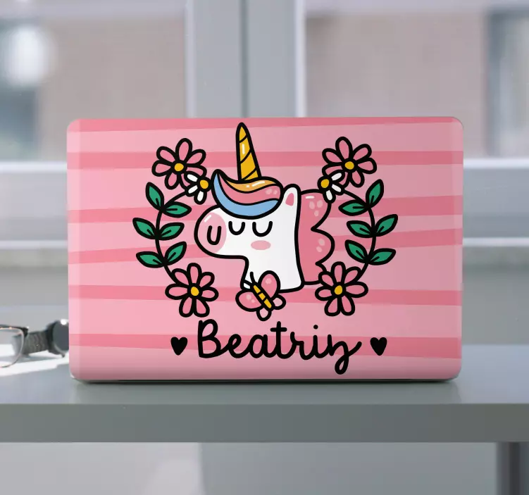 Introducing our stunning Laptop skin unicorn floral design, where whimsical charm meets vibrant colors! This captivating design features a delightful mix of pink hues, unicorns, and flowers, all beautifully intertwined with playful stripes. Personalize your laptop with your custom name elegantly displayed, creating a unique touch that truly reflects your personality. This customizable skin showcases a delightful doodle style that is both cute and eye-catching, adding a splash of color and creativity to your workspace.