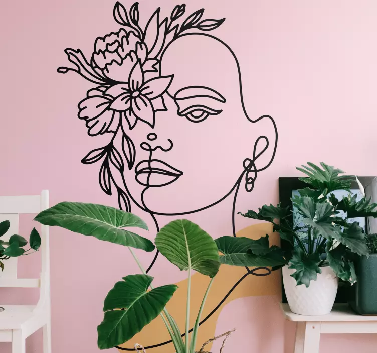Reference: A51291A captivating portrayal featuring a minimalist line drawing of a woman's face adorned with various flowers. This composition blends femininity and nature, creating a harmonious focus on beauty and elegance, perfect for enhancing any living space with a touch of artistry.