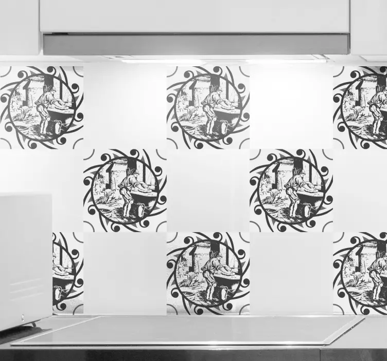 Discover the enchanting Object sticker vintage craft scene, a fusion of artistic expression and abstract design! This stunning sticker features a captivating baking theme with a person surrounded by intricate tile engravings, all presented in a striking black and white palette. Its unique artistic flair makes it a perfect addition to any craft lover's collection.