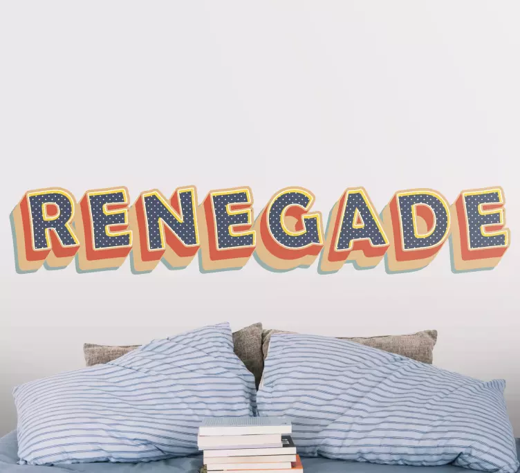 Reference: A48092The captivating lettering of 'Renegade' features a striking mix of colors and shapes, making a bold statement. This eye-catching design adds personality and flair to any space, inviting a sense of individuality and creativity.
