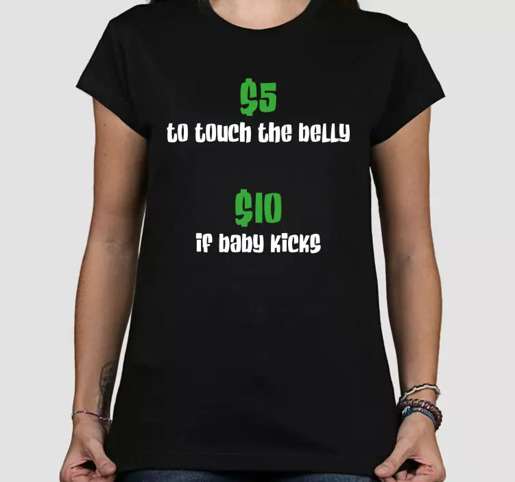 Reference: T5441This playful design showcases a humorous take on pregnancy interactions, featuring bold green text on a black background. It presents a lighthearted proposal for touching a baby bump with playful pricing, making it perfect for expecting parents or baby showers.