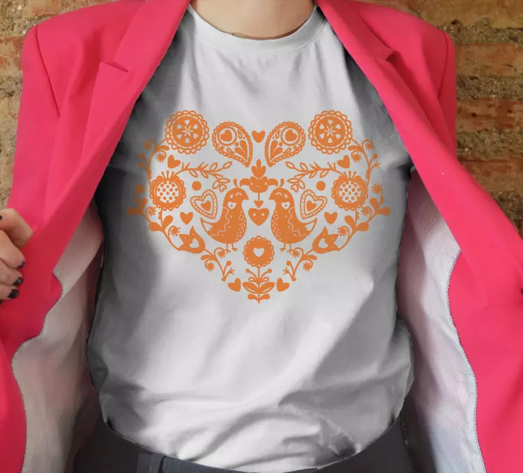 Introducing our stunning Heart pattern birds t-shirt, an exquisite blend of traditional folklore and modern style! This unique design showcases ornate flowers and charming birds intertwined within a heart motif, all presented in striking black and white. The polish of the fabric adds a touch of elegance, making it a perfect choice for those who cherish love and the beauty of folk art.