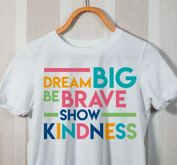 Introducing the Inspire with kindness t-shirt, a vibrant expression of positivity and motivation! This design features an uplifting quote surrounded by colorful graphics that embody dreams, bravery, and kindness. The multicolor text is youthful and energetic, perfect for those who want to show their commitment to spreading good vibes.