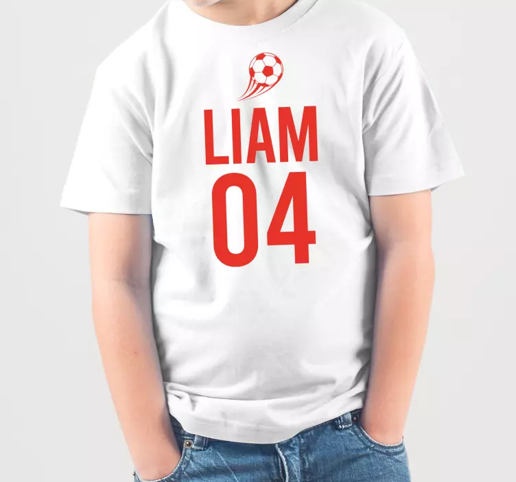 Reference: T4113This design features a vibrant soccer theme, showcasing the name 'Liam' alongside the number '04'. The colors are striking with bold reds contrasted against a white backdrop, perfect for young soccer enthusiasts.