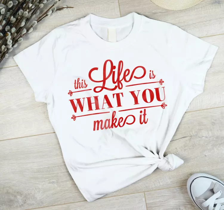 Reference: T4937This design features a strong motivational quote emphasizing the theme of life being what you make of it. The bold lettering and vibrant colors capture attention, making it an excellent choice for casual wear to inspire positivity.