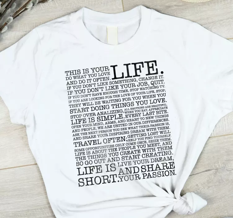 Reference: T4871This design features an inspirational message encouraging individuals to live their passion and embrace life's opportunities. The bold text enhances the motivational theme, attracting attention and promoting a positive mindset. Perfect for those seeking encouragement through wearable expression.