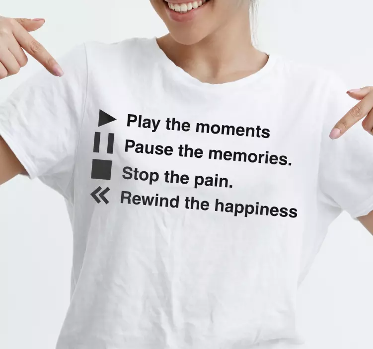 Introducing the Moments of happiness t-shirt, a delightful blend of emotions and inspiration! This unique t-shirt showcases a creative design featuring play, pause, and stop symbols intertwined with motivational text and powerful quotes. In striking black and white, it captures the essence of happiness and memory, making it a perfect addition to your wardrobe that not only looks good but also uplifts your spirit!