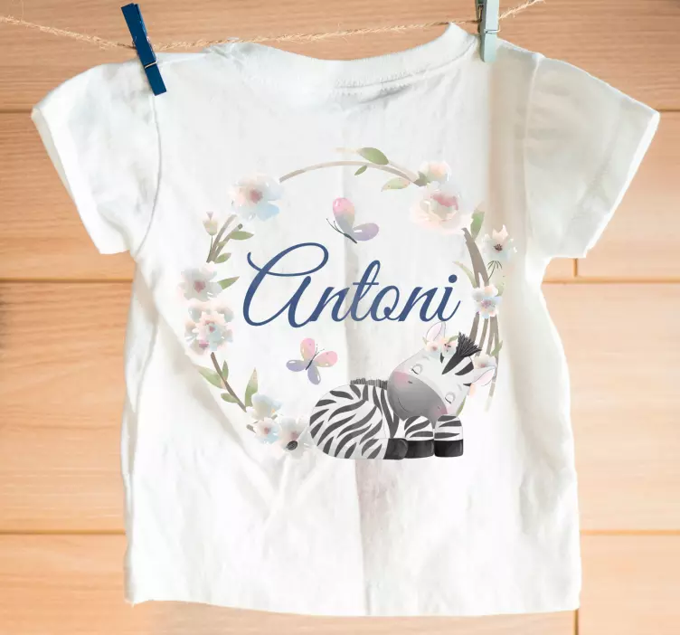 Introducing our Personalized zebra nursery baby t-shirt, a delightful piece featuring a whimsical design that showcases a cute zebra peacefully sleeping within a charming wreath of colorful flowers. This enchanting watercolour artwork is customisable, allowing you to add your baby's name for an extra personal touch, making it the perfect addition to any nursery!