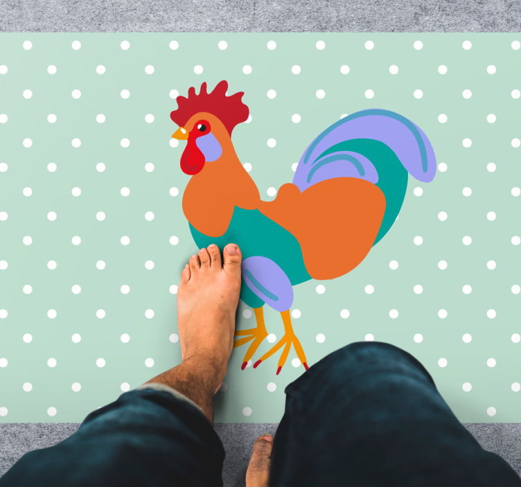 Introducing our vibrant Animal vinyl rug with colorful rooster design! This playful piece features a charming rooster illustration set against a lively pattern background filled with delightful dots and polka dots. Its cartoonish style adds a cheerful touch to any space, making it a perfect addition to brighten up your home!
