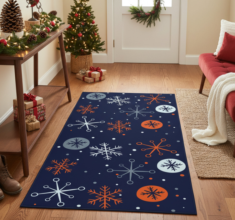 Embrace the festive spirit with our Christmas vinyl rug with blue and orange snowflakes Christmas vinyl rug! This delightful piece serves as an eye-catching centerpiece, making your living room, dining area, or any corner of your home feel like a winter wonderland. Its unique design not only enhances your decor but also adds a layer of warmth and charm that invites joy and togetherness during the holiday season.