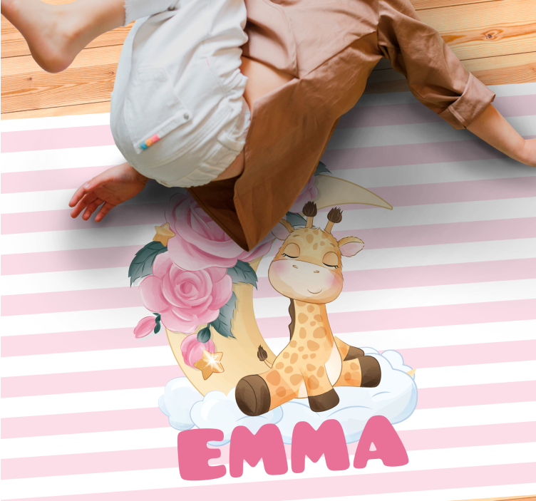 Transform your child's space with our enchanting Custom happy giraffe nursery vinyl rug. This delightful design features a cute giraffe surrounded by vibrant flowers and fluffy clouds, all in lovely pink hues. You can even add a personal touch by customizing it with your child's name, making it a truly unique addition to their nursery!
