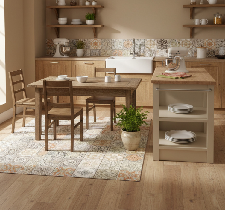 Reference: R19844Transform your kitchen into a warm and inviting space with our Vintage warm collage kitchen vinyl rug. Featuring a delightful blend of nostalgic patterns and colors, this rug effortlessly enhances your decor while providing a cozy atmosphere. Its stunning design is not only visually appealing but also functional, making it a perfect addition to any kitchen!