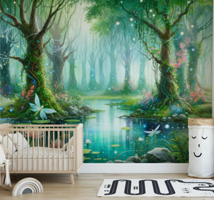 Reference: F11950Transform your space into a dreamy woodland escape with our Forest wall mural whimsical fairy design. This enchanting mural features playful fairies frolicking amidst lush trees and vibrant foliage, bringing a sense of magic and wonder to any room. The mural showcases beautiful matt colours that create a soft, inviting atmosphere, perfect for sparking imagination and creativity!