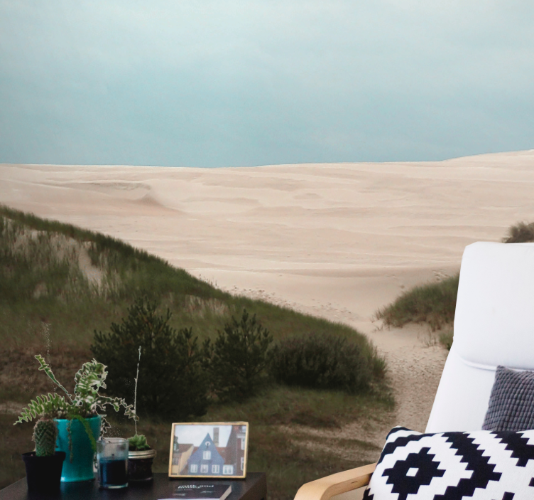 Transform your space with our stunning Sandy dune path landscape wall mural. This captivating design beautifully captures the essence of nature, featuring serene sand dunes that stretch under a vast sky, inviting you to escape to a tranquil scenery. The gentle curves of the dunes create a peaceful path, allowing you to envision a walk through this picturesque landscape.