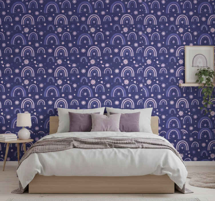Applying our Purple rainbows wall paper in bedroom wall paper in bedroom is simple and enjoyable! Use glue to secure it to your wall, and all you need are a roller, a brush, and a cutter for a flawless finish. With the right tools and a bit of creativity, you'll have your beautiful new wallpaper up in no time!
